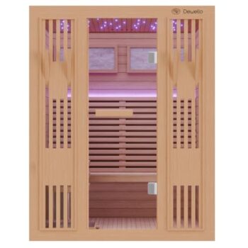 • Dewello® Infrarotkabine Infrarotsauna MILTON 90×90 für 1 Personen aus Hemlock Holz mit Vollspektrumstrahler, LED-Farblicht Sternenhimmel und Steinwand, Bluetooth, FM,MP3,USB